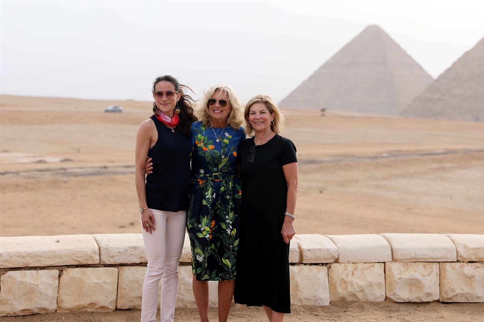 وقامت السيدة الأمريكية الأولى جيل بايدن صباح اليوم السبت بزيارة منطقة الأهرامات بالجيزة وتوقفت أمام الهرم الأكبر "خوفو".