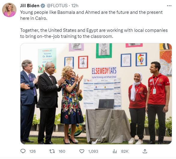 وفي تدوينة، لها على صفحتها على مواقع التواصل الاجتماعى، قالت جيل بايدن "الشباب مثل بسملة وأحمد هم المستقبل والحاضر هنا فى مصر"، وأضافت أن مصر وأمريكا تعملان معا مع الشركات المحلية لتوفير التدريب أثناء الدراسة.