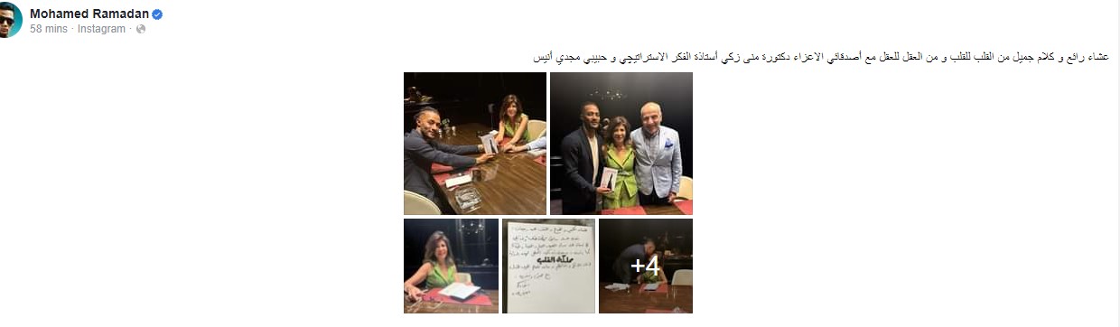 نشر محمد رمضان عبر صفحته على موقع تبادل التواصل الإجتماعي “الفيسبوك” علق عليها قائلًا:" عشاء رائع و كلام جميل من القلب للقلب و من العقل للعقل مع أصدقائي الاعزاء دكتورة منى زكي أستاذة الفكر الاستراتيچي و حبيبي مجدي أنيس".