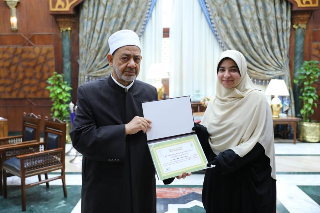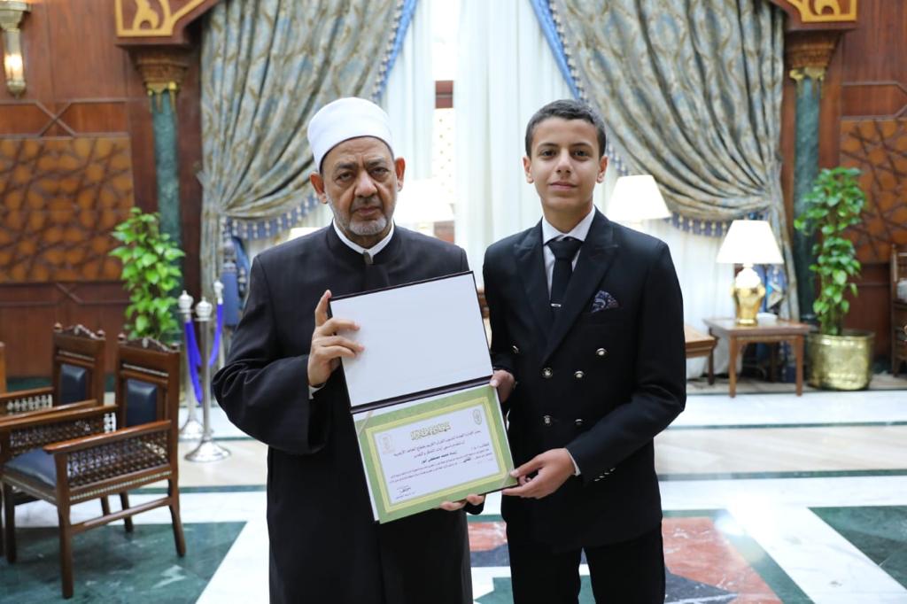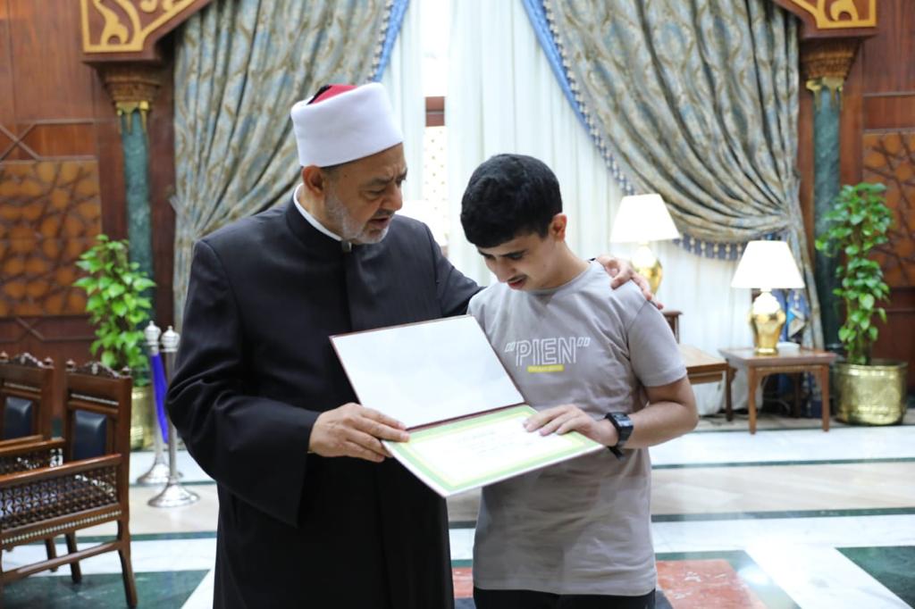 وكرَّم شيخ الأزهر يوم الخميس أوائل مسابقة الأزهر السنوية لحفظ القرآن الكريم، اليوم الخميس، بمقر مشيخة الأزهر، بحضور لفيف من قيادات الأزهر، مؤكدًا فضيلته اعتزاز وتقدير الأزهر الشريف لأبنائه من حفظة كتاب الله، موصيًا إياهم بمواظبة الحفظ والتدبر لمعاني القرآن الكريم، ونقل تجربتهم لزملائهم وتشجيعهم على بدء رحلة الحفظ والتدبر، مضيفًا: «القرآن الكريم تاج فوق رؤوسكم، وأنتم خير سفراء للأزهر الشريف، ونقدر مجهودكم وما يبذله أمهاتكم وآباؤكم وشيوخكم لدفعكم نحو تحقيق هذا الإنجاز حتى وصلتم اليوم إلى منصة التكريم، داوموا على التفوق والاجتهاد، واجعلوا مما تعلمتموه وحفظتموه منهجًا ومنهاجا لحياتكم».