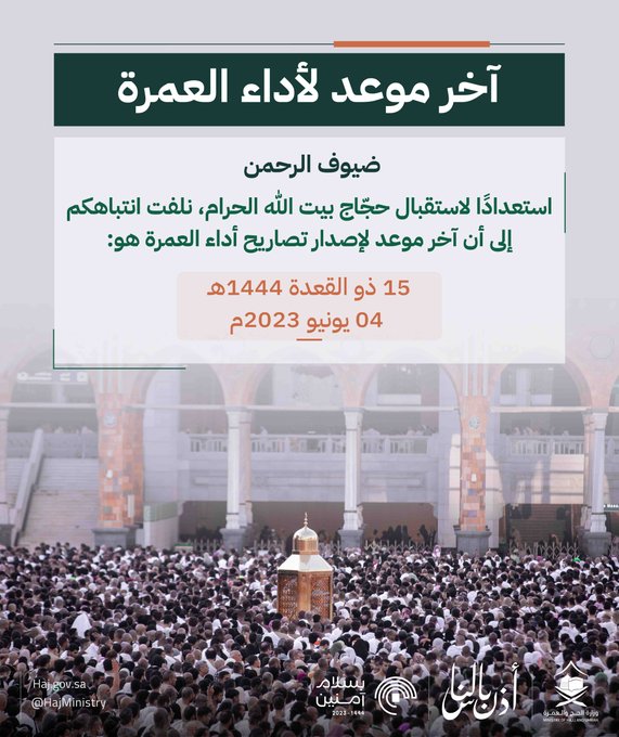 وشددت على أن آخر موعد لمغادرة المعتمرين هو 29 ذو القعدة 1444هـ الموافق 18 يونيو 2023.