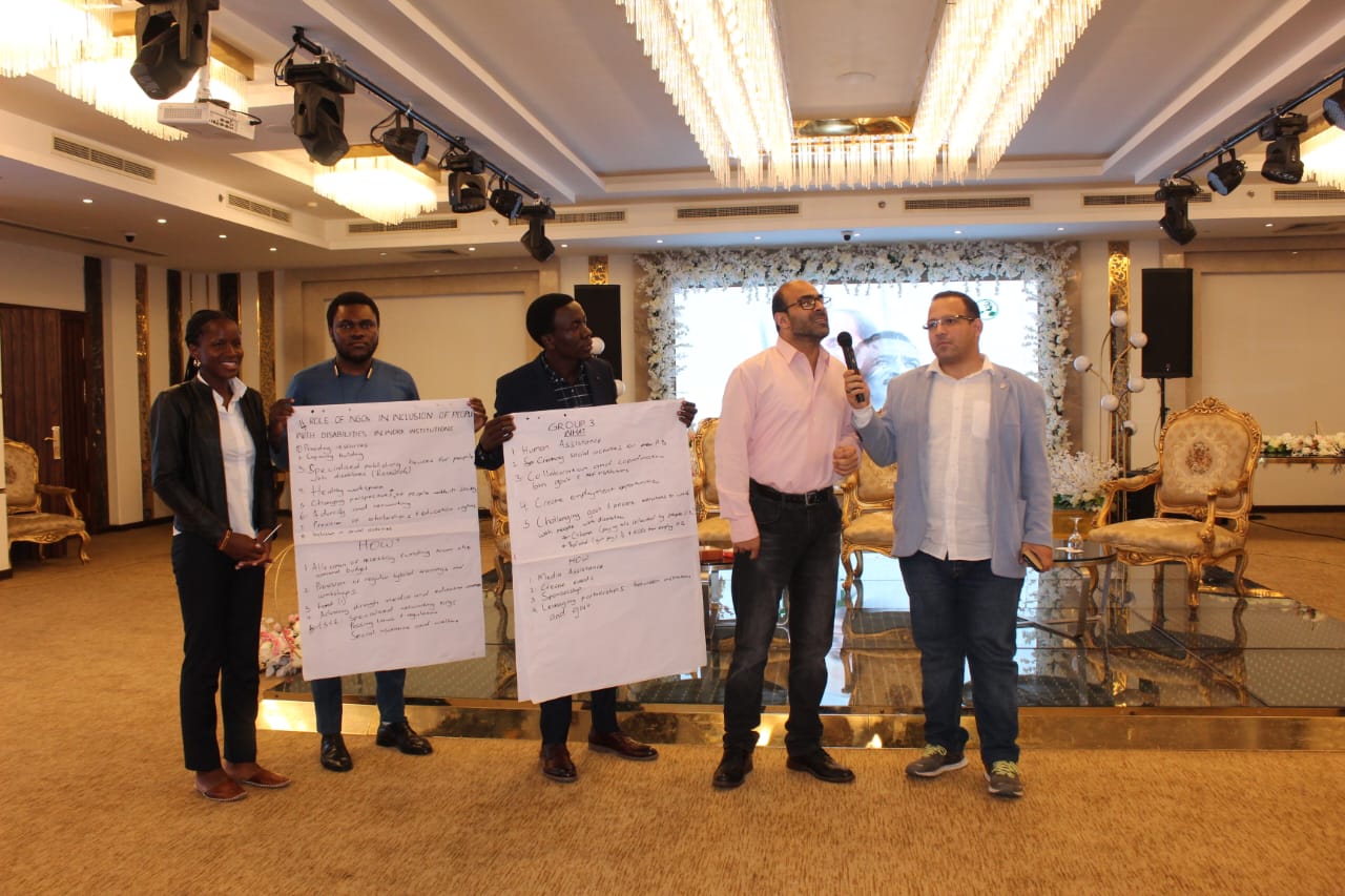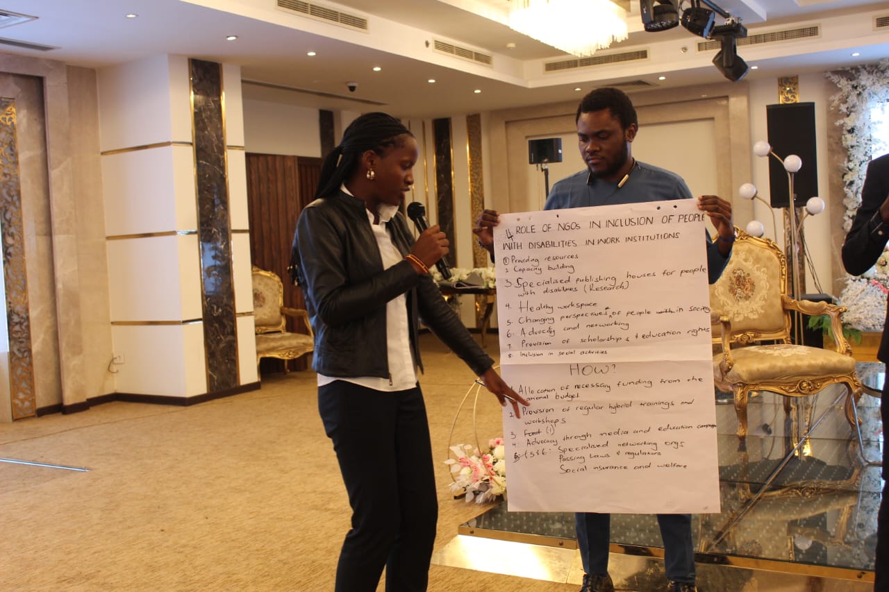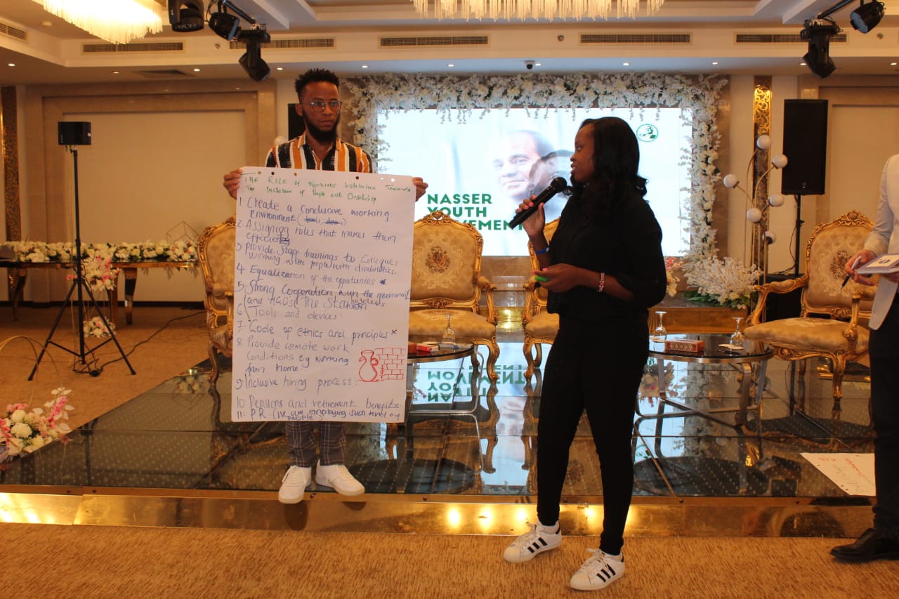 وعلي هامش الجلسة أقيمت ورشة عمل حول كيفية دمج ذوي القدرات والهمم فى مؤسسات العمل، وما هى التحديات التى يواجهها الأشخاص ذوى الإعاقة فى مؤسسات العمل فى بلادنا المختلفة، وماهو دور الحكومات ودور المجتمع المدنى ودور مؤسسات العمل نفسها فى هذا الدمج، ووعرض المشاركون توصيات تتبناها منحة ناصر للقيادة الدولية.