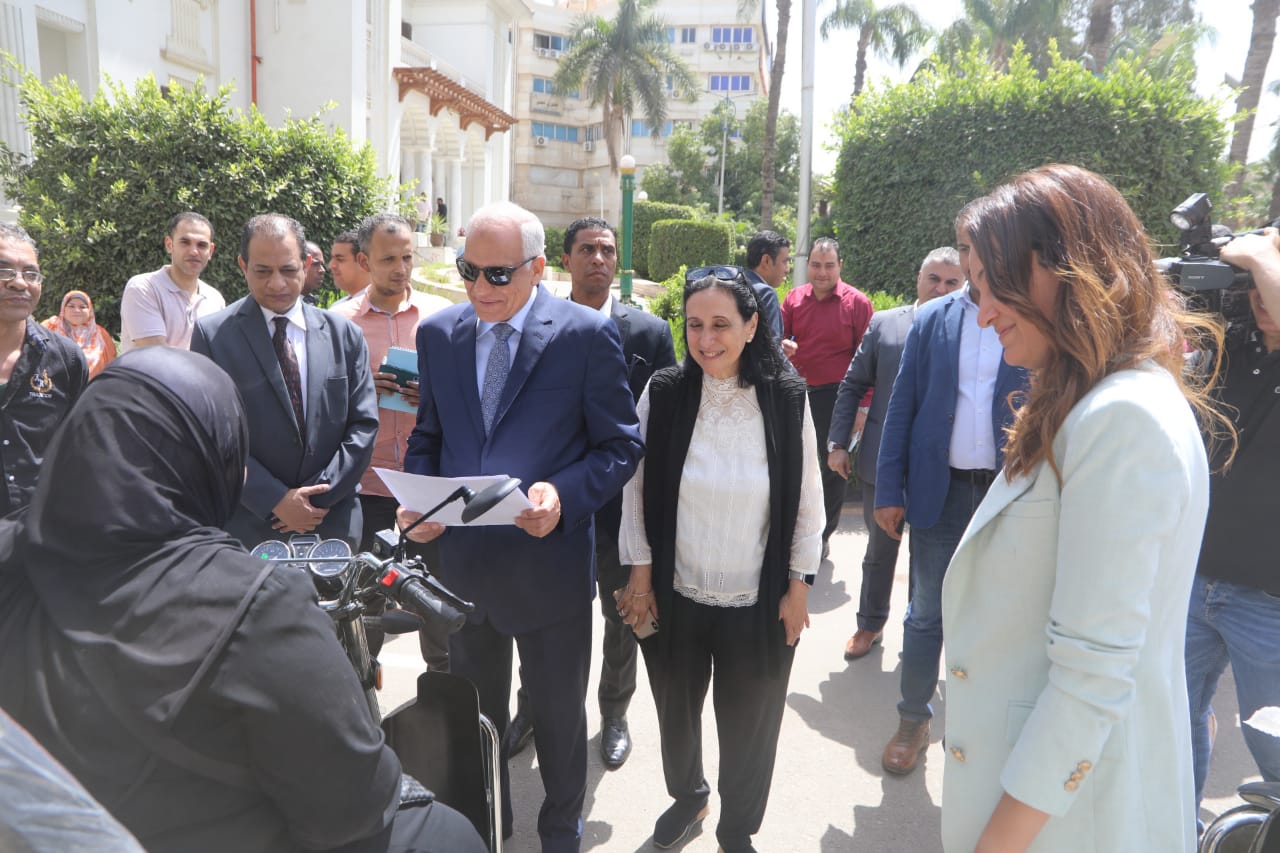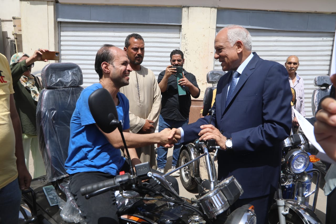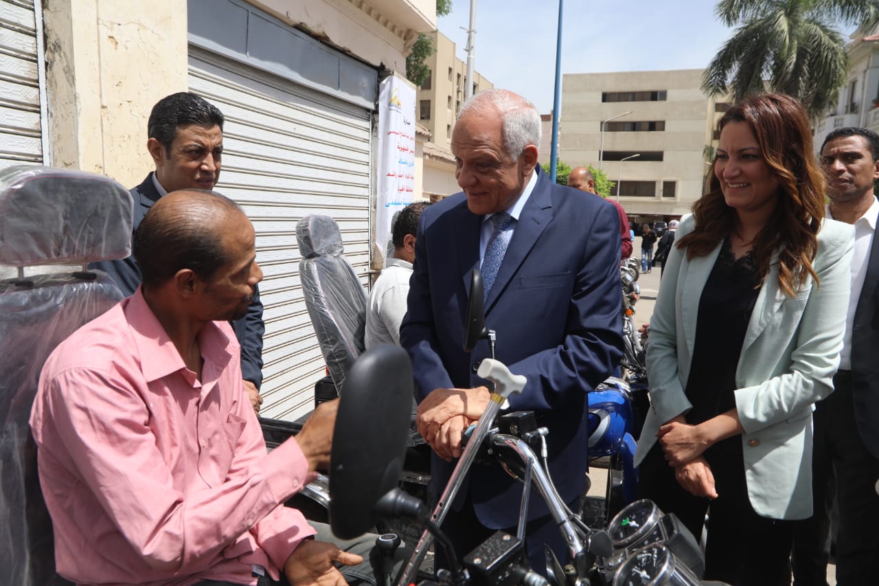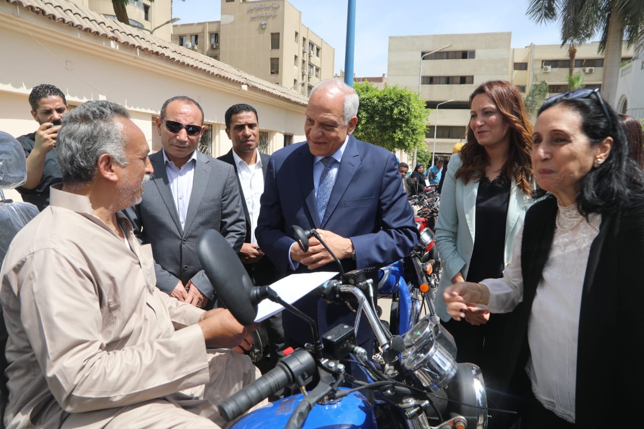 محافظ الجيزة يسلم 57 موتوسيكل مجهز طبياً وكرسى كهربائى لذوى الهمم