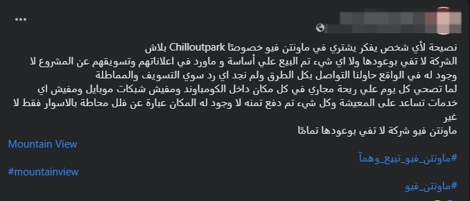 حيث استعرض أحد المتضررين مع شركة ماونتن فيو مشكلته قائلا " نصيحة لأي شخص يفكر يشتري في ماونتن فيو خصوصًا Chilloutpark بلاش الشركة لا تفي بوعودها ولا اي شيء تم البيع علي أساسة و ماورد في اعلاناتهم وتسويقهم عن المشروع لا وجود له في الواقع حاولنا التواصل بكل الطرق ولم نجد اي رد سوي التسويف والمماطلة".