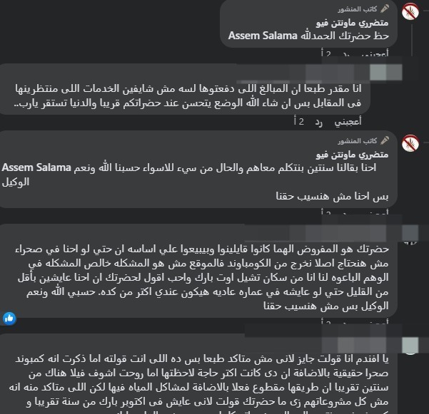 وتابع عن شركة ماونتن فيو ووحداتها،" لما تصحي كل يوم علي ريحة مجاري في كل مكان داخل الكومباوند ومفيش شبكات موبايل ومفيش اي خدمات تساعد على المعيشة وكل شيء تم دفع تمنه لا وجود له المكان عبارة عن فلل محاطة بالاسوار فقط لا غير ماونتن فيو شركة لا تفي بوعودها تمامًا".