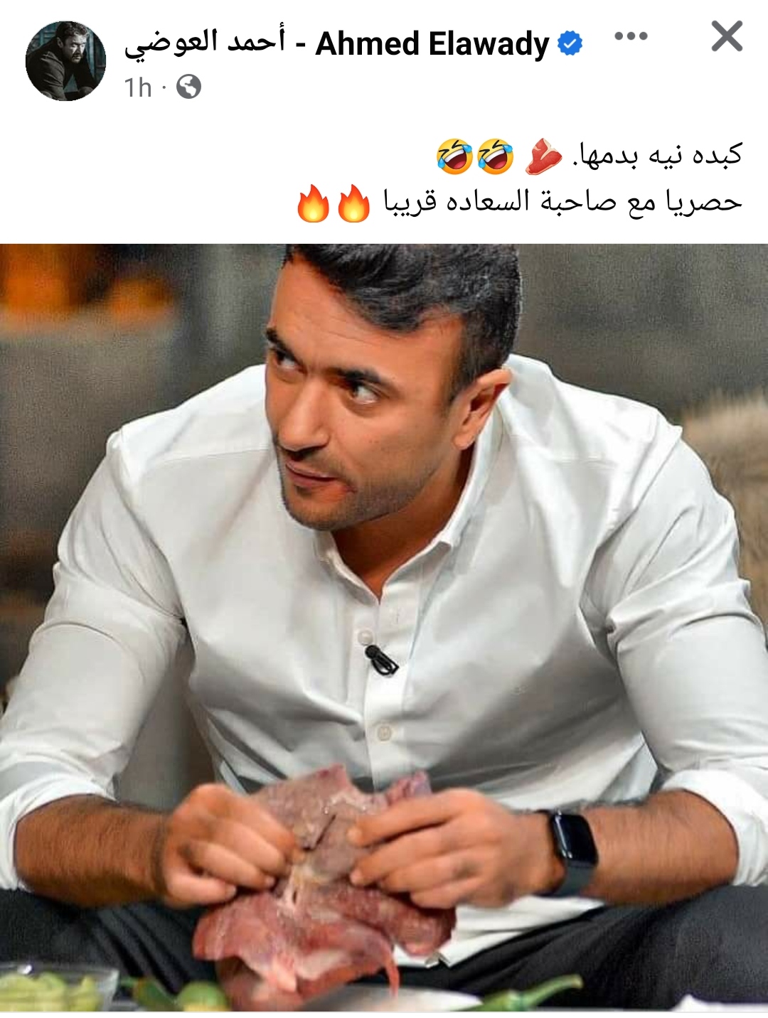 ياسمين عبد العزيز.. نشر أحمد العوضي، صورة وهو سأكل الكبدة نيئة، عبر صفحته على موقع التواصل الإجتماعي "الفيسبوك" وعلق عليها قائلا: "الكبده نية بدمها حصريا مع صاحبة السعاده قريبا".