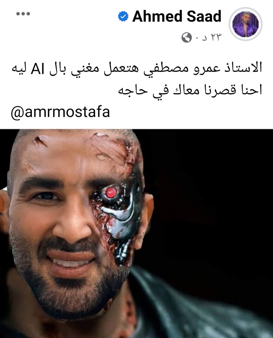 ونشر أحمد سعد، عبر صفحته على موقع التواصل الإجتماعي "الفيسبوك" صورة له بالذكاء الاصطناعي وعلق عليها قائلا:" الاستاذ عمرو مصطفى هتعمل مغني بال ai ليه احنا قصرنا معاك في إيه ".