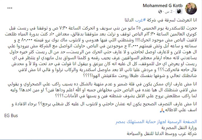 وقال صاحب الواقعة" انا اتعرضت لسرقة في شركة غرب الدلتا حجزت للاسكندرية يوم الخميس 25 مايو من بني سويف و اتحركت الساعة 7.30 ص و توقفنا في ريست قبل كوبري العالمين الساعة 13.30 الباص توقف و نزلت بعد متوقفنا بدقائق، معداش 10 دقائق كنت بدورة المياه طلعت لاقيت الباص مش موجود اتحرك!!!! وشنطتي اللي فيها هدومي و لابتوب ماك بوك برو قيمته 80.000ج و سماعه و ساعه آبل وتش قيمتهم 12.000 ج موجودين في الباص. حاولت اتواصل مع الشركة مش بيرودوا علي ال هوت لاين و لاعارف اوصل لحاجتي و لا عارف حتي اتحرك من الريست".