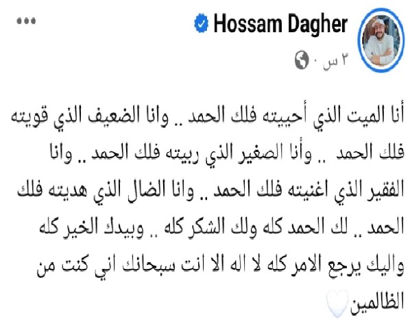 وكتب حسام داغر، عبر حسابه الشخصي بموقع التواصل الاجتماعي "فيسبوك"، قائلا:"أنا الميت الذي أحييته فلك الحمد.. وأنا الضعيف الذي قويته فلك الحمد.. وأنا الصغير الذي ربيته فلك الحمد".