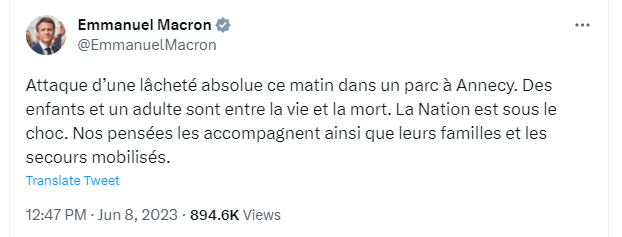 وكتب على "تويتر" إن "الهجوم الذي وقع هذا الصباح في حديقة في آنسي هو جبن مطلق"، وتابع، مشيرا إلى أن "الأطفال والبالغين المصابين على إثره بين الحياة والموت، وتم حشد خدمات الطوارئ لإسعافهم".