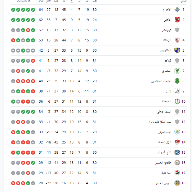 وجاء جدول ترتيب الدوري المصري كالاتي: