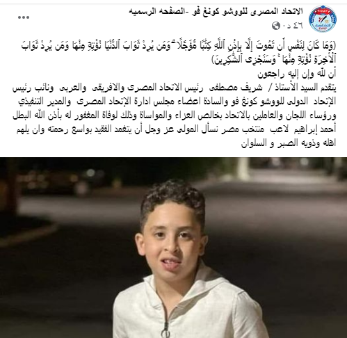 وكان أحمد ابراهيم لاعب منتخب مصر للكونغ فو تعرض قبل أيام لحادث سير بعدما صدمته دراجة نارية مما أدي إلي دخوله المستشفي بالعناية المركزة إثر الحادث الا أنه فارق الحياة مؤخرا.