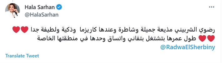 كتبت هالة سرحان من خلال تغريدة لها عبر حسابها الرسمي بموقع التغريدات القصيرة توتير، : "رضوى الشربيني مذيعة جميلة وشاطرة وعندها كاريزما وذكية ولطيفة جدا طول عمرها بتشتغل بتفاني واتساق وحدها في منطقتها الخاصة".