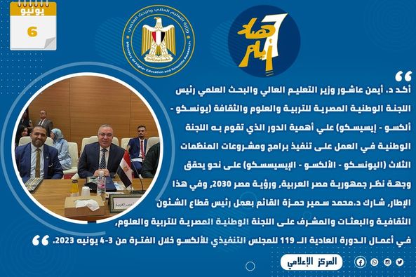 4) أكد د. أيمن عاشور وزير التعليم العالي والبحث العلمي رئيس اللجنة الوطنية المصرية للتربية والعلوم والثقافة (يونسكو - ألكسو - إيسيسكو) علي أهمية الدور الذي تقوم به اللجنة الوطنية في العمل على تنفيذ برامج ومشروعات المنظمات الثلاث (اليونسكو - الألكسو - الإيسيسسكو) على نحو يحقق وجهة نظر جمهورية مصر العربية، ورؤية مصر 2030، وفي هذا الإطار، شارك د.محمد سمير حمزة القائم بعمل رئيس قطاع الشئون الثقافية والبعثات والمشرف على اللجنة الوطنية المصرية للتربية والعلوم، في أعمال الدورة العادية الـ 119 للمجلس التنفيذي للألكسو خلال الفترة من 3-4 يونيه 2023.