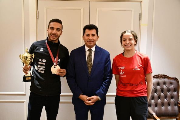 وزير الرياضة يستقبل مهند شعبان بطل الخماسي الحديث وهنا جودة بطلة تنس الطاولة