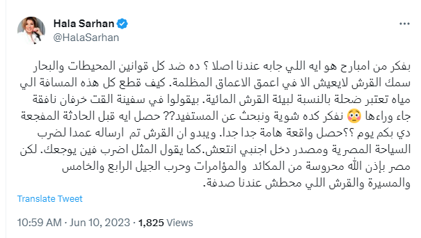 وقالت سرحان في تغريدتها: "بفكر من امبارح هو ايه اللي جابه عندنا اصلا؟ ده ضد كل قوانين المحيطات والبحار سمك القرش لا يعيش الا في أعمق الاعماق المظلمة. كيف قطع كل هذه المسافة الي مياه تعتبر ضحلة بالنسبة لبيئة القرش المائية. بيقولوا في سفينة القت خرفان نافقة جاء وراءها.. نفكر كده شوية ونبحث عن المستفيد؟؟ حصل ايه قبل الحادثة المفجعة دي بكم يوم؟؟ حصل واقعة هامة جدا جدا".