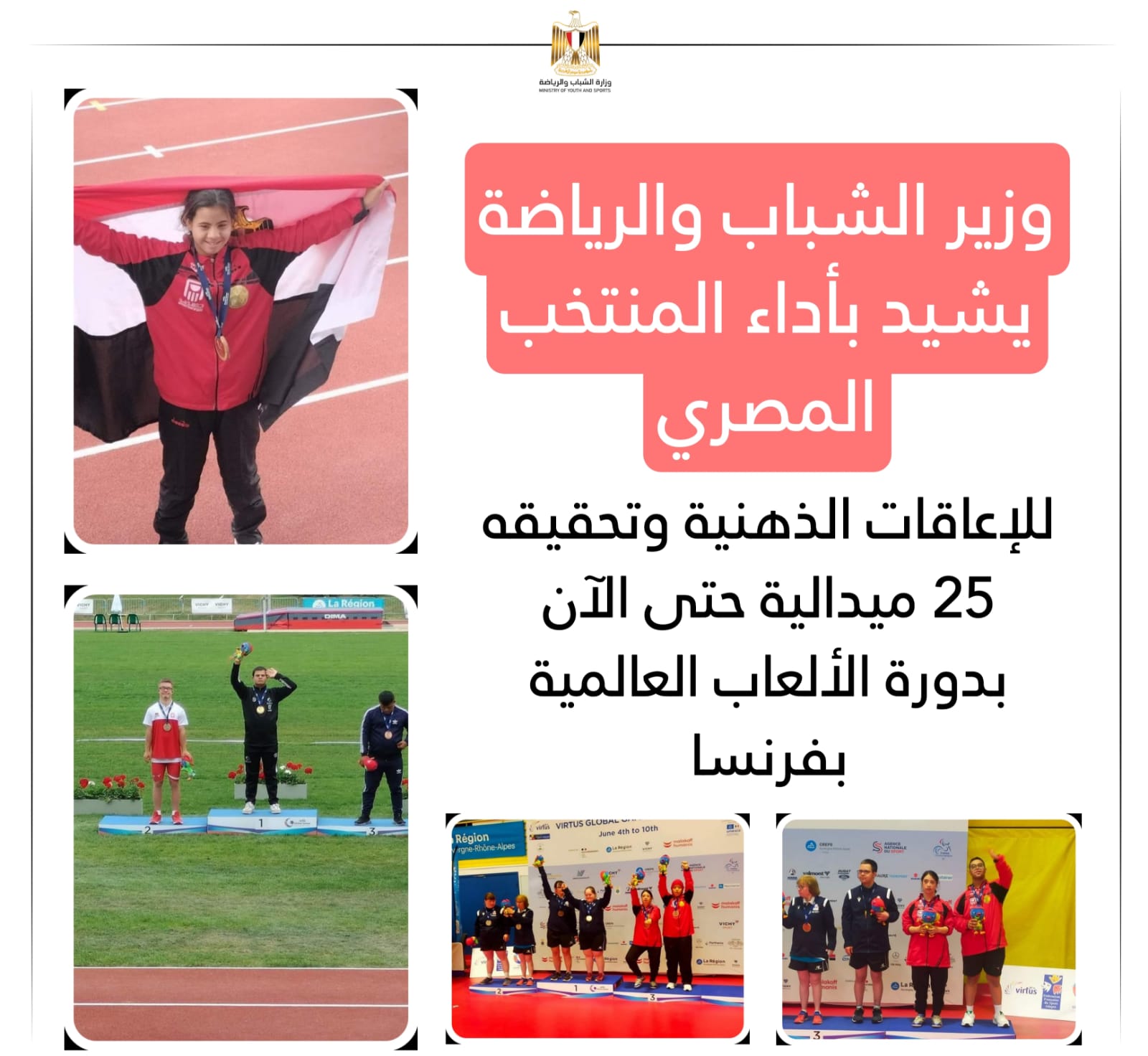 أشاد وزير الشباب والرياضة الدكتور أشرف صبحي، بأداء المنتخب المصرى للإعاقات الذهنية، وتحقيقه 25 ميدالية متنوعة حتي الآن في دورة الألعاب العالمية، والمقامة حالياً في فرنسا خلال الفترة من 4 وحتى 10 يونيو الجاري، بمشاركة 1500 لاعب ولاعبة، من 95 دولة.