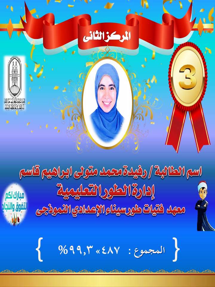 وحصلت الطالبه رفيده محمد متولي ابراهيم، إداره الطور التعليميه معهد طور سيناء الاعدادي على مجموع 487 ونسبه نجاح 99،3٪.