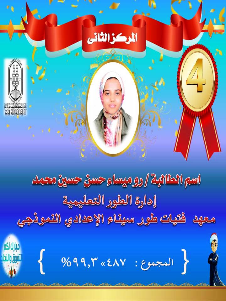 وحصلت الطالبه روميساء حسن حسين محمد، إداره الطور التعليميه معهد فتيات طور سيناء الاعدادي على المركز الثالث بمجموع 99%.