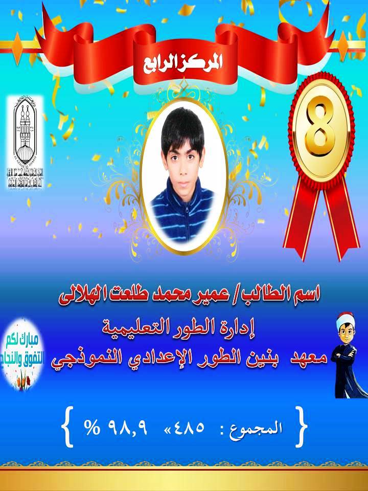 وحصل الطالب عمير محمد طلعت الهلالي، إداره الطور التعليميه معهد بنين الطور الاعدادي النموذجي حصل على مجموع 98.9%.