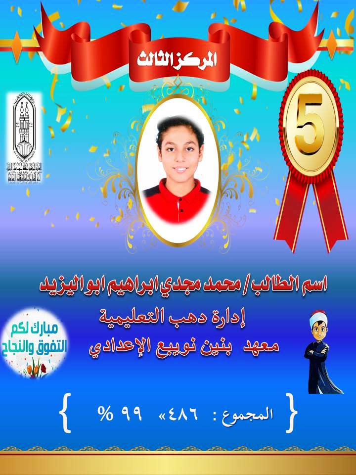 وحصل الطالب محمد مجدي إبراهيم ابو اليزيد، إداره دهب التعليميه معهد بنين نويبع على مجموع 99%.