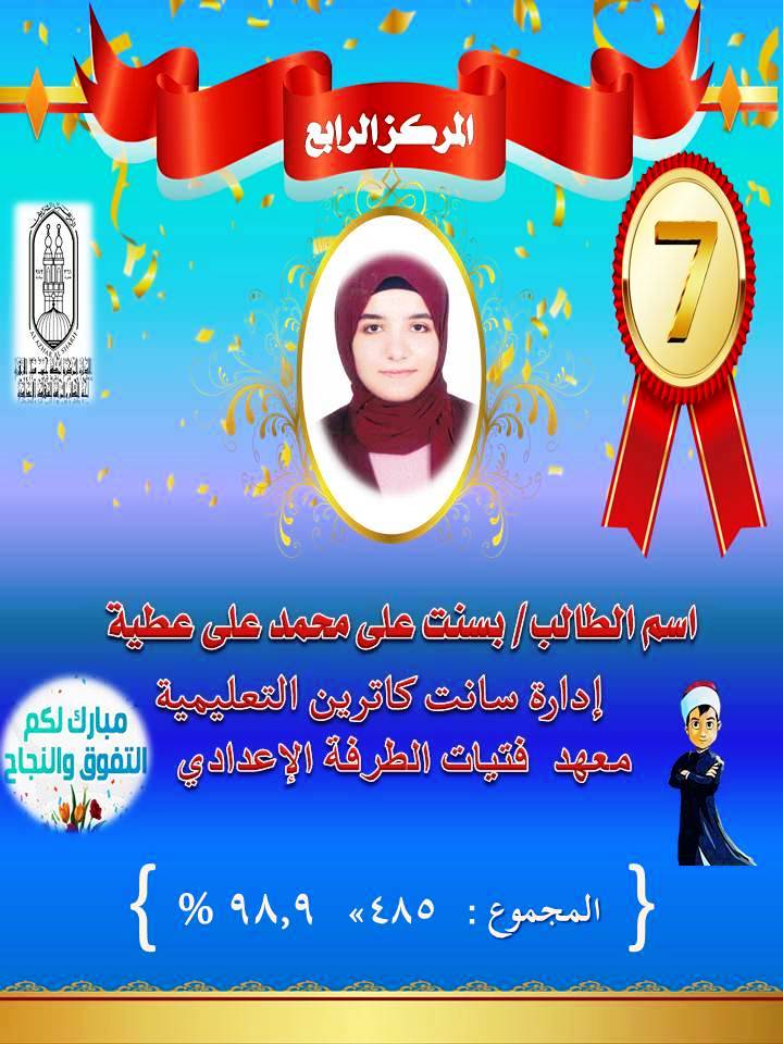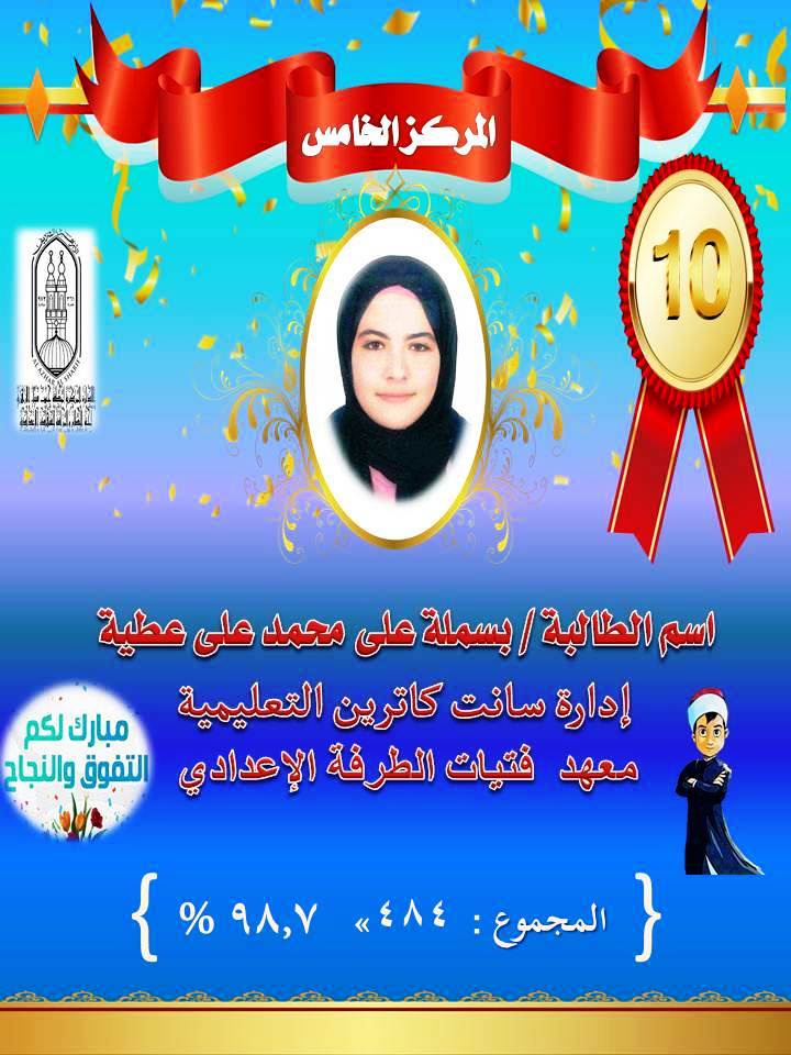 بسمله علي محمد علي عطيه، إداره كاترين التعليميه معهد فتيات الطرفه حصلت على مجموع 98.7%.