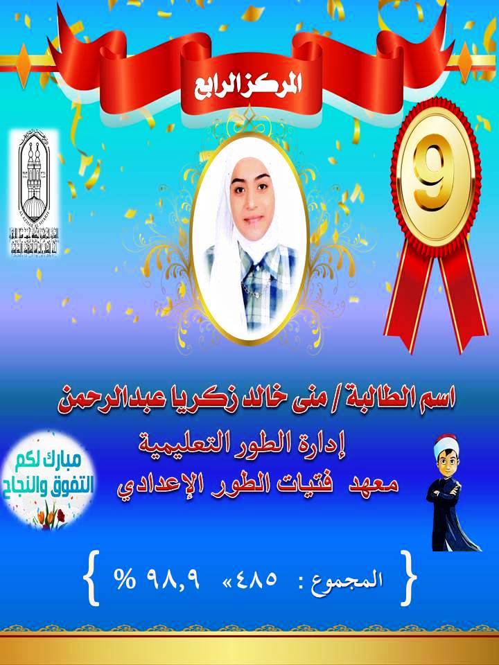 وحصل الطالب منى خالد زكريا عبد الرحمن، إداره الطور التعليميه معهد فتيات الاعدادي النموذجي على 98.9 %.