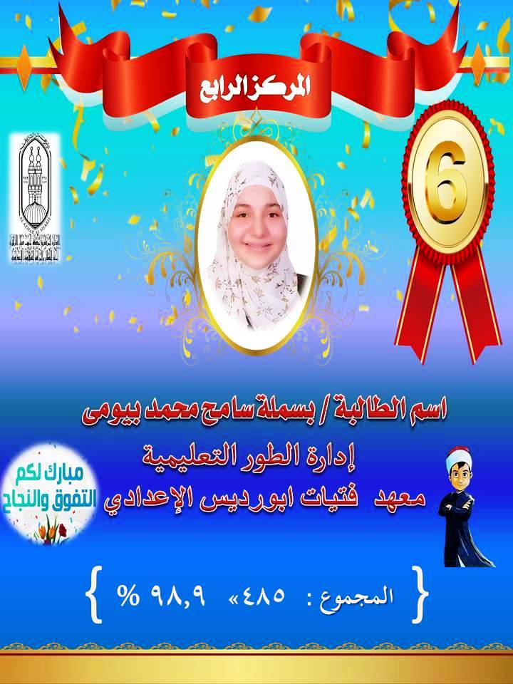 حصلت الطالبه بسمله سالم محمد بيومي، إداره الطور التعليميه معهد فتيات ابو رديس على مجموع 98.9%.