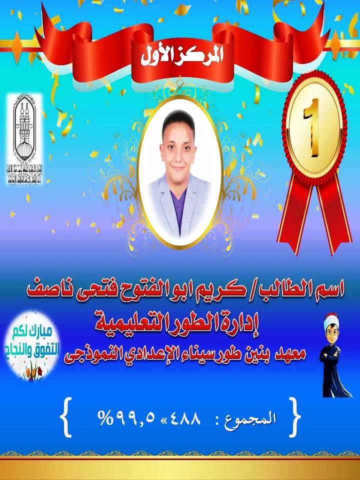 وحصل على المركز الاول على مستوى محافظه جنوب سيناء الطالب كريم ابو الفتوح فتحي اداره الطور التعليميه معهد بنين طور سيناء بنسبه نجاح 99.5%.