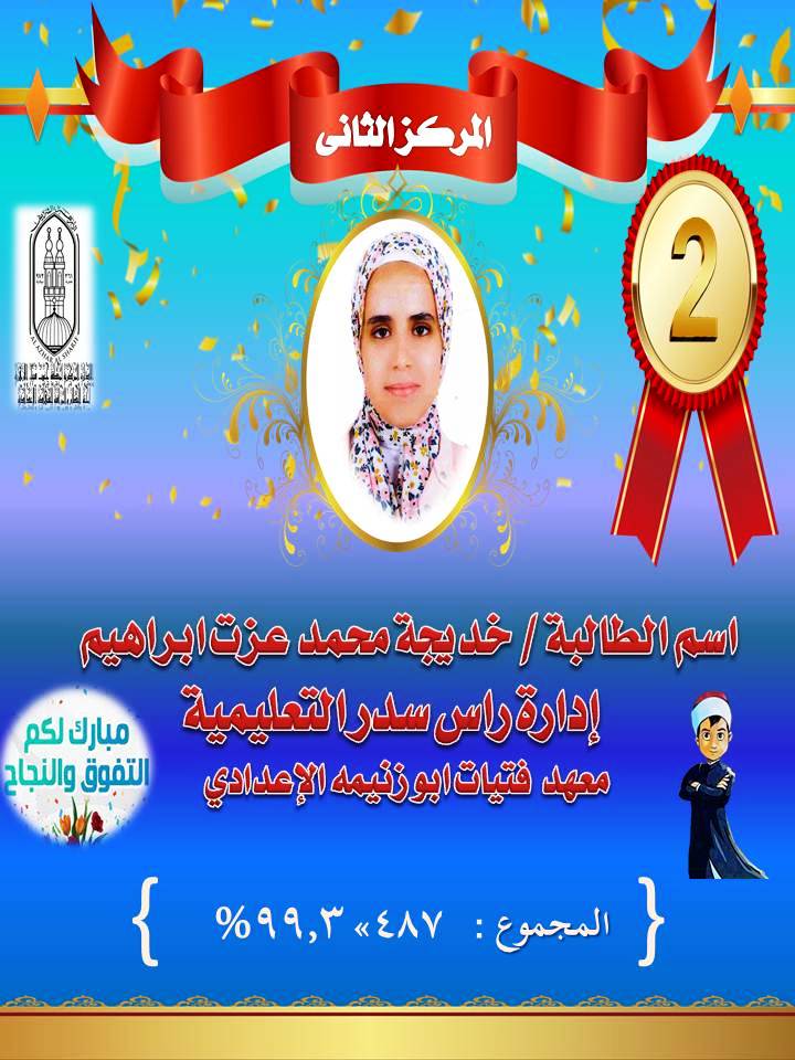 وحصل على المركز الثاني الطالبه خديجه محمد عزت ابراهيم، إداره رأس سدر التعليميه معهد فتيات ابو زنيمه بنسبه نجاح 99.3%.
