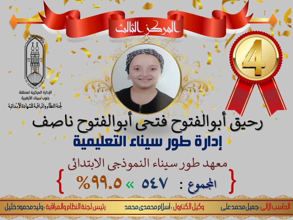 وحصلت الطالبه رحيق ابو الفتوح فتحى اداره الطور التعليميه معهد طور سيناء النموذجى على المركز الثالث بمجموع 99.5%