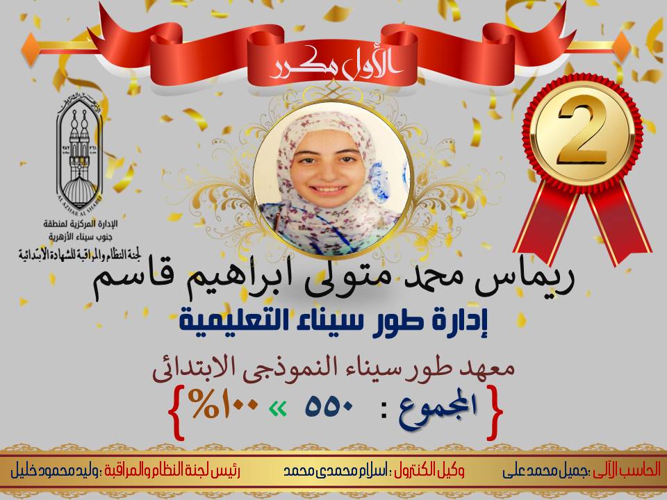 وحصل على المركز الاول مكرر الطالبه ريماس محمد متولى ابراهيم قاسم ادارة طور سيناء معهد طور سيناء النموذجى الابتدائى بنسبة 100%