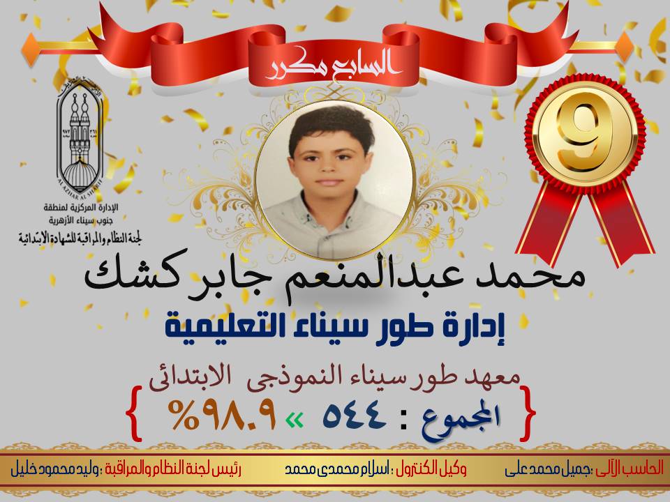 وحصل الطالب محمد عبدالمنعم احمد كشك اداره طور سيناء التعليميه معهد طور سيناء النموذجى عى 98.9 %.
