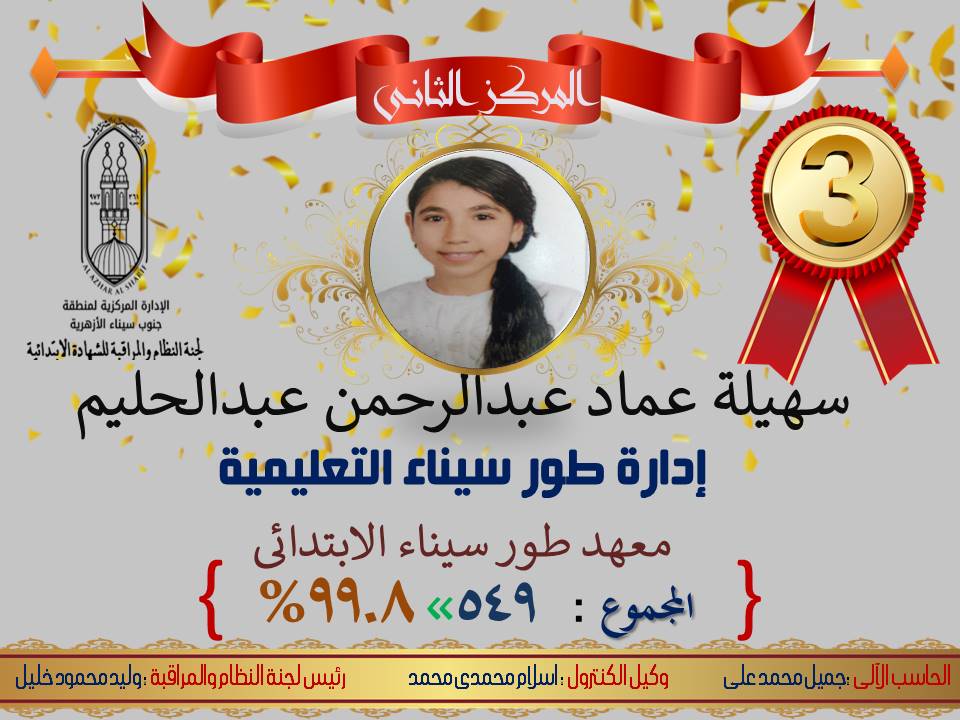 وحصلت الطالبه سهيلة عماد عبدالرحمن اداره الطور التعليميه معهد طور سيناء االابتدايى على المركز الثانى بنسبة نجاح 99.8%