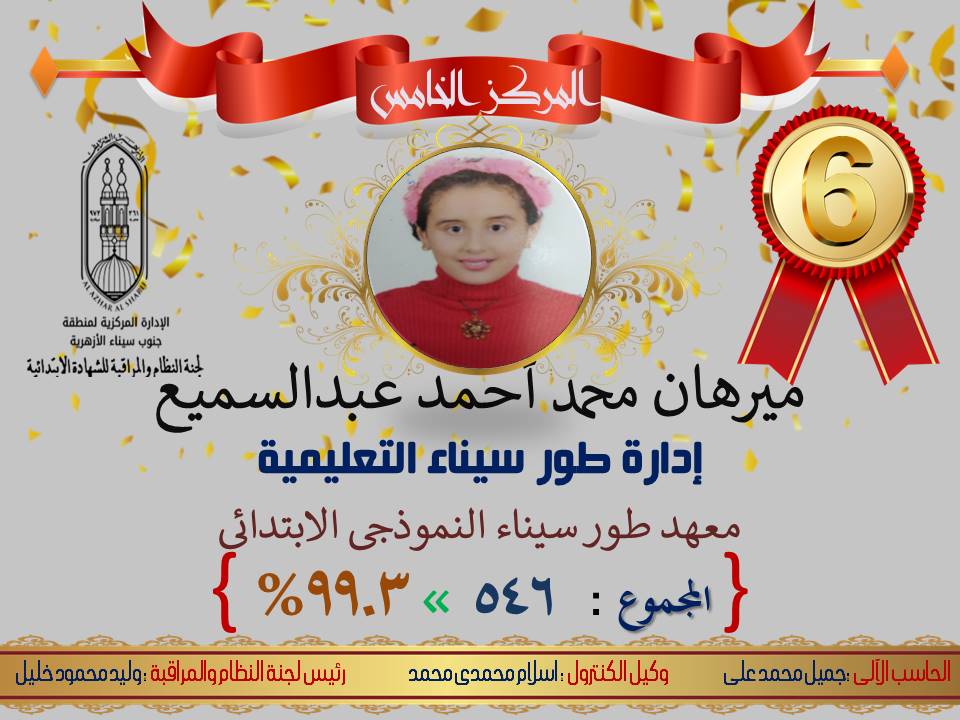 حصلت الطالبه ميرهان محمد احمد عبدالسميع اداره الطور التعليميه معهد الطور النموذجى على مجموع 99.3 % والمركز الخامس