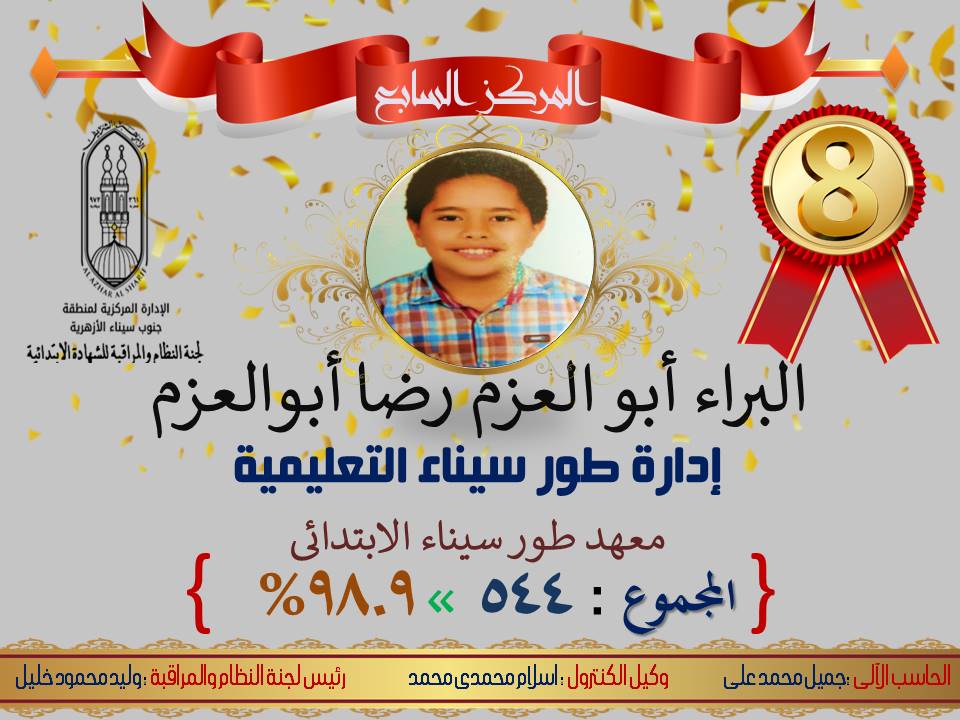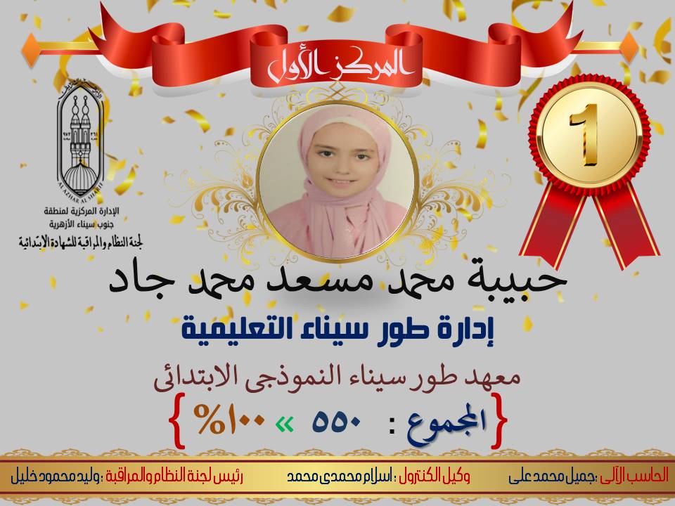 وحصل على المركز الاول على مستوى محافظه جنوب سيناء الطالب حبيبة محمد مسعد محمد جاد اداره الطور التعليميه معهد طور سيناء النموذجى الابتدائى وحصلت على نسبة نجاح 100%
