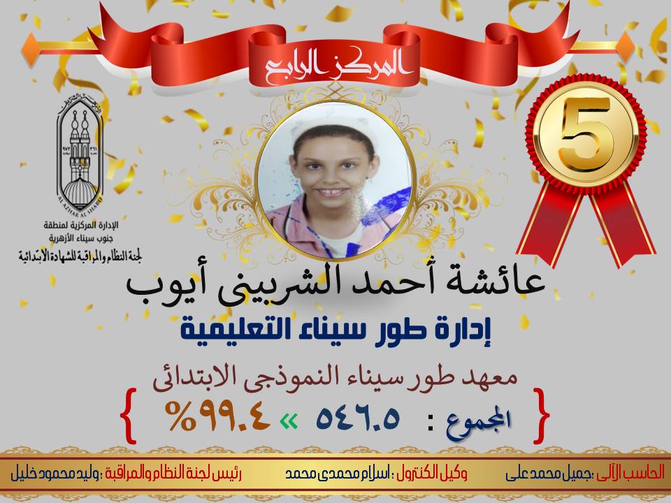 وحصل الطالبة عائشة احمد الشربينى ايوب داره الطور التعليميه معهد طور سيناء النموذجى بمجموع 99.4%