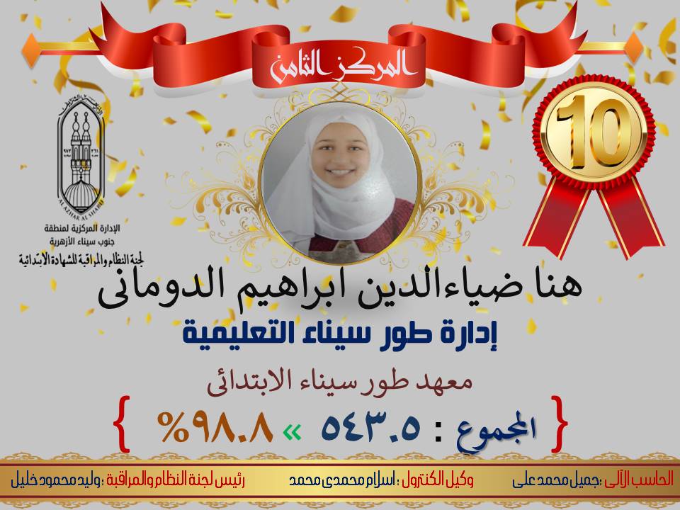 وحصلت الطالبة هنا ضياء الدين ابراهيم الدومانى على المركز الثامن إدارة طور سيناء التعليمية معهد طور سيناء النموذجى بمجموع 98.9%