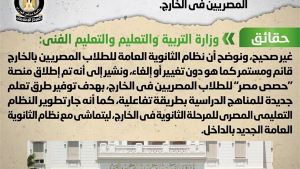 كشف المركز الإعلامى لمجلس الوزراء إنه فى ضوء ما تردد من أنباء بشأن صدور قرار بإلغاء نظام الثانوية العامة للطلاب المصريين في الخارج، تواصل المركز مع وزارة التربية والتعليم والتعليم الفني، والتي نفت تلك الأنباء، مُؤكدةً أنه لا صحة لصدور أي قرارات بإلغاء نظام الثانوية العامة للطلاب المصريين في الخارج، وأن نظام الثانوية العامة للطلاب المصريين بالخارج قائم ومستمر كما هو دون تغيير أو إلغاء، مُوضحةً أنه تم إطلاق منصة "حصص مصر" للطلاب المصريين في الخارج، بهدف توفير طرق تعلم جديدة للمناهج الدراسية بطريقة تفاعلية، كما أنه جار تطوير النظام التعليمي المصري للمرحلة الثانوية في الخارج، ليتماشى مع نظام الثانوية العامة الجديد بالداخل.