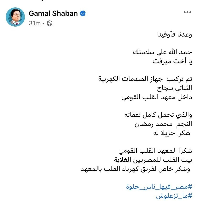 وتابع: تم تركيب جهاز الصدمات الكهربية الثنائي بنجاح داخل معهد القلب القومي، والذي تحمل كامل نفقاته النجم محمد رمضان.. شكرًا جزيلًا له.. شكرًا لمعهد القلب القومي بيت القلب للمصريين الغلابة.. وشكر خاص لفريق كهرباء القلب بالمعهد