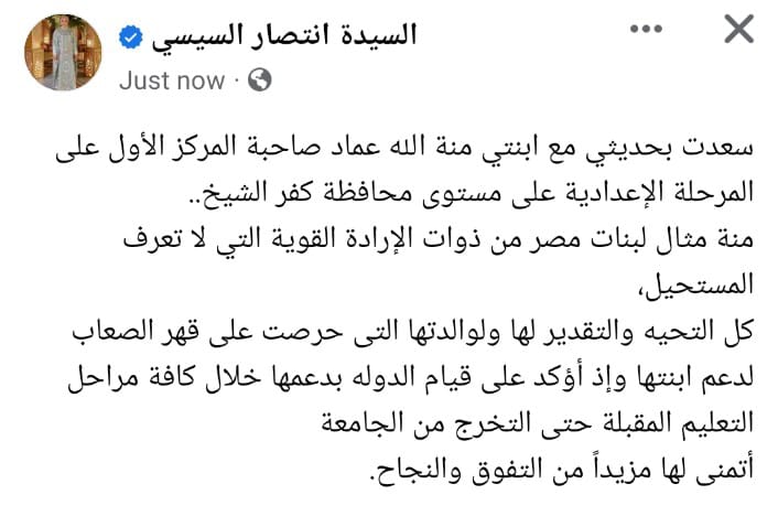 السيدة انتصار السيسى سعدت بحديثي مع ابنتي منة الله عماد صاحبة المركز الأول على المرحلة الإعدادية