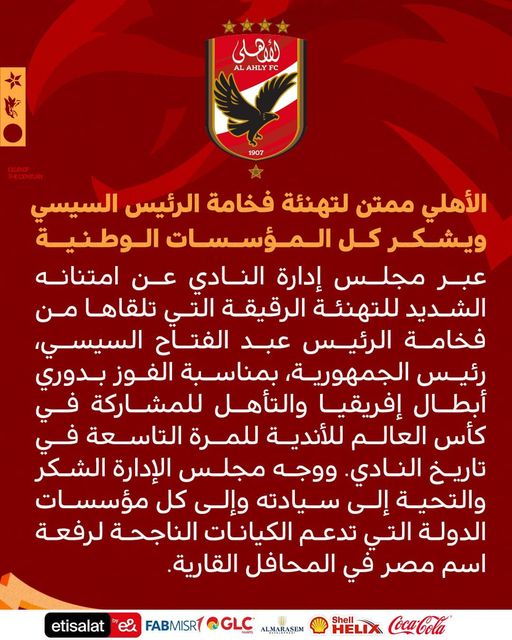 الأهلي يعرب عن امتنانه لتهنئة فخامة الرئيس السيسي ويشكر كل المؤسسات الوطنية