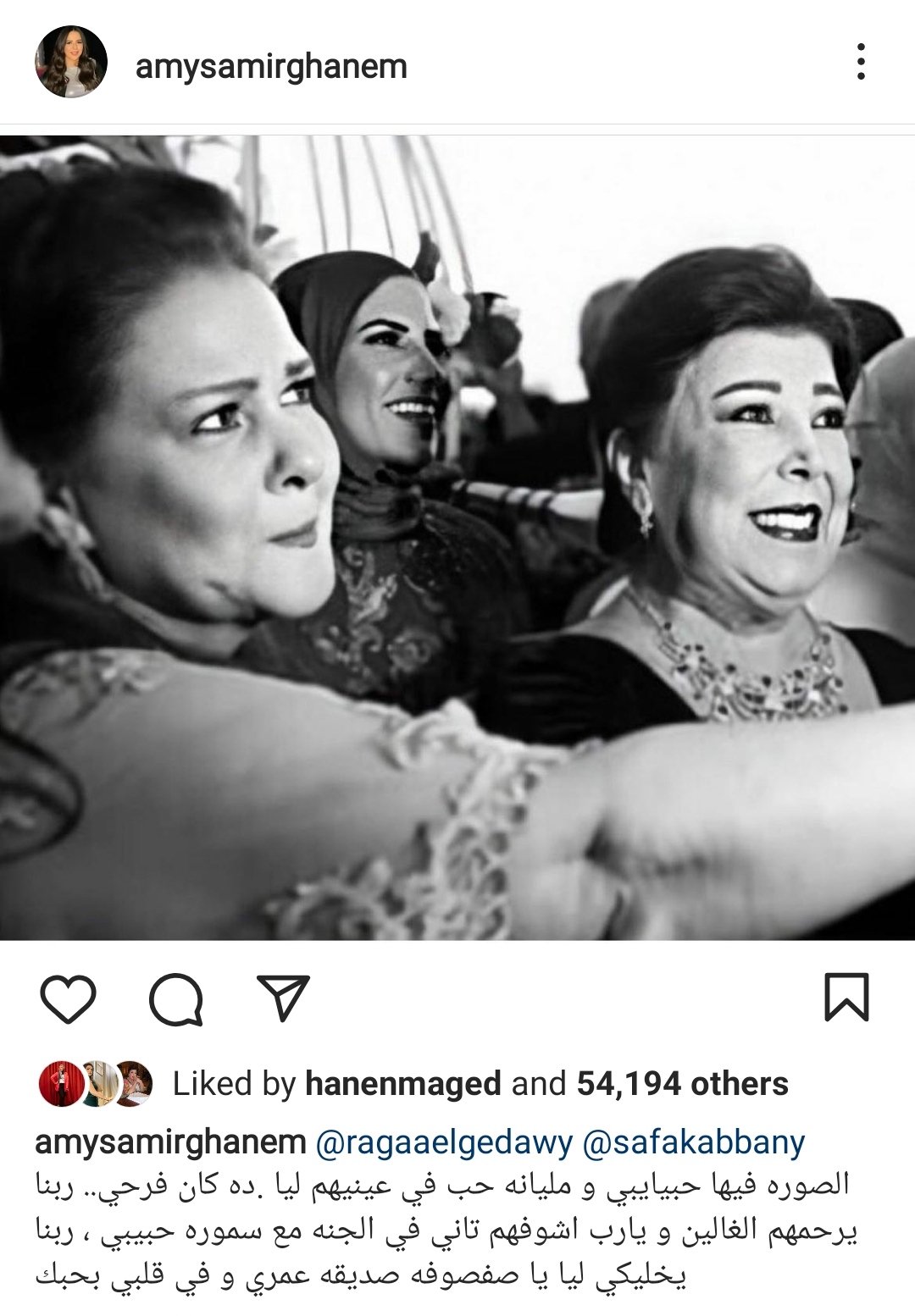 ونشرت إيمي الصورة عبر حسابها الشخصي بموقع تبادل الصور والفيديوهات "انستجرام"، وعلقت:" الصورة فيها حبايبي ومليانة حب في عينيهم ليا، ده كان فرحي، ربنا يرحمهم الغاليين ويا رب أشوفهم تاني في الجنة مع سمورة حبيبي، ربنا يخليكي ليا يا صفصوفة صديقة عمري وفي قلبي بحبك".