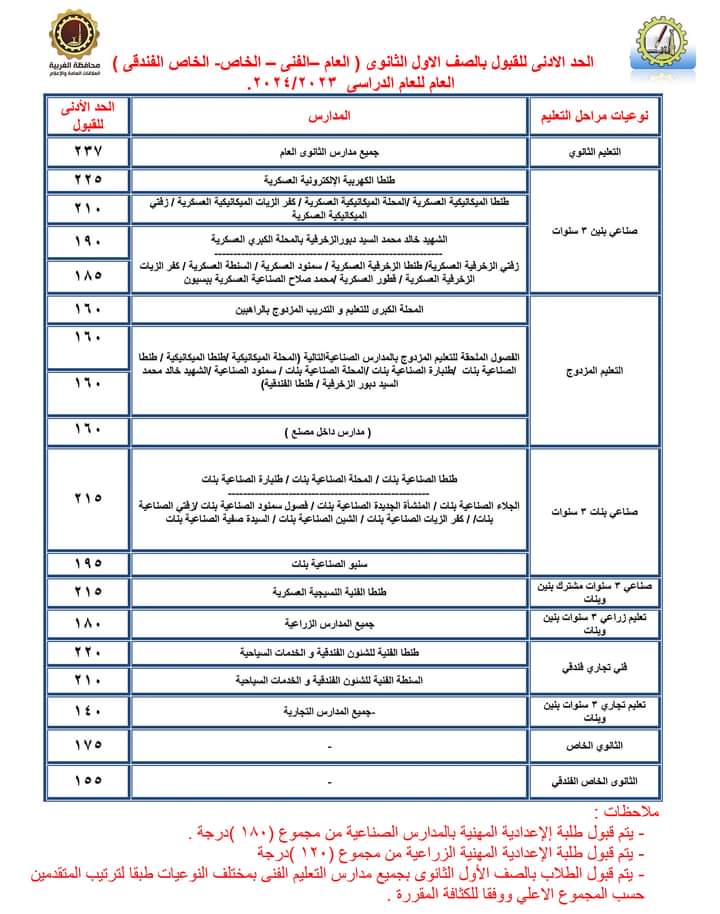 وتقرر أن يكون الحد الأدنى للقبول بالثانوي العام (237) درجة، الحد الأدنى للقبول بالثانوي الخاص(175) درجة والحد الأدنى للقبول بالثانوي الخاص الفندقي (155) درجة، على أن يكون الحد الأدنى للقبول بالصف الأول الثانوي بمدارس التعليم الفني بنوعيتها طبقا للجدول المرفق.