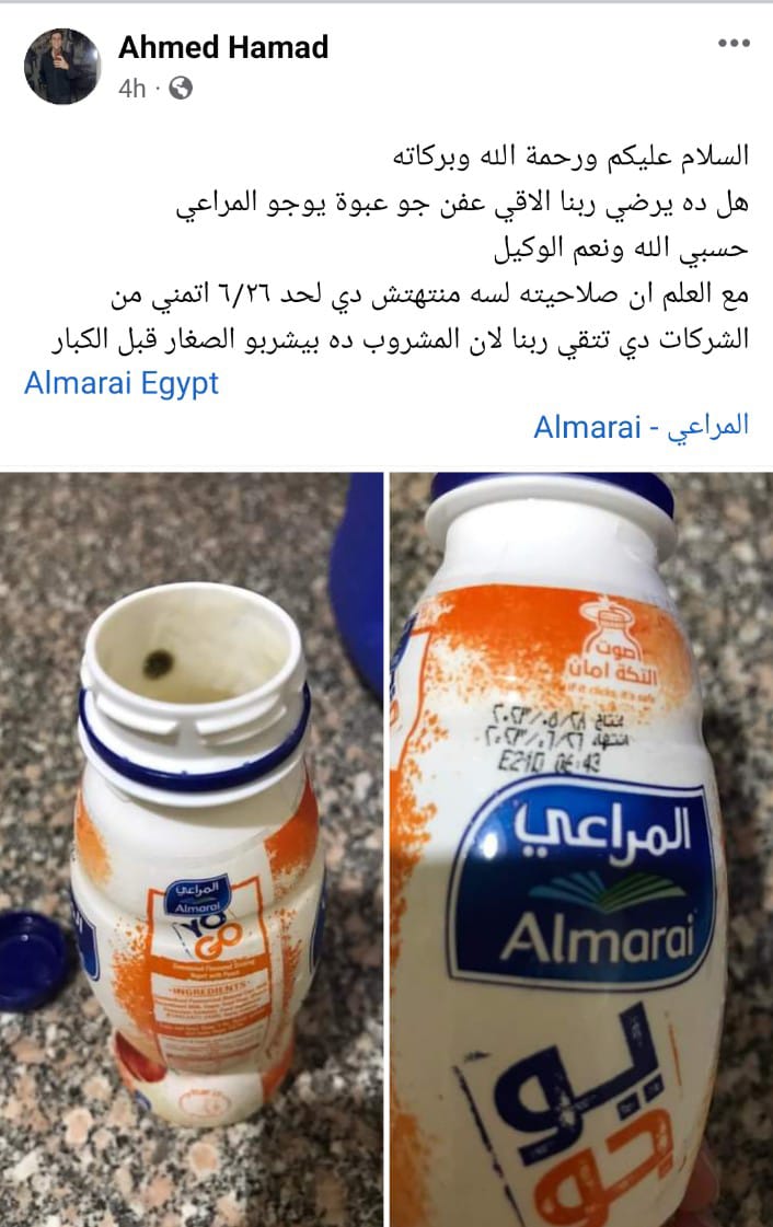 وقال صاحب الواقعة عن منتجات شركة المراعي ،" السلام عليكم ورحمة الله وبركاته هل ده يرضي ربنا الاقي عفن جو عبوة يوجو المراعي حسبي الله ونعم الوكيل مع العلم ان صلاحيته لسه منتهتش دي لحد 6/26 اتمني من الشركات دي تتقي ربنا لان المشروب ده بيشربو الصغار قبل الكبار".