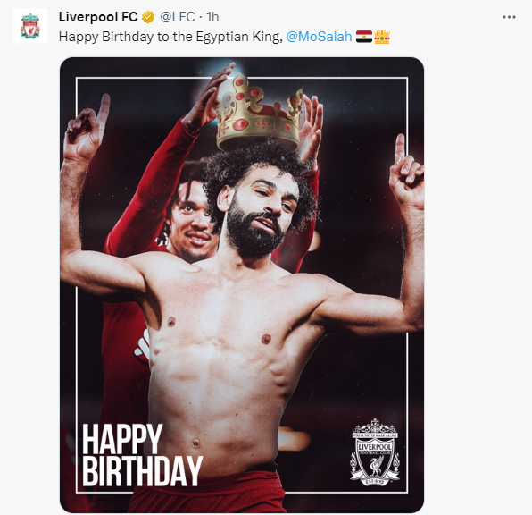 وكتب نادي ليفربول الإنجليزي عبر صفحته الرسمية على موقع التواصل الإجتماعي "تويتر": "عيد ميلاد سعيد للملك المصري".