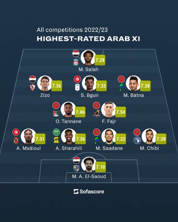 وجاءت التشكيلة المثالية للاعبين العرب الأعلى تقييماً في المسابقات التي تشملها قاعدة بيانات "سوفاسكور" الإحصائية للموسم الماضي، كالتالي: