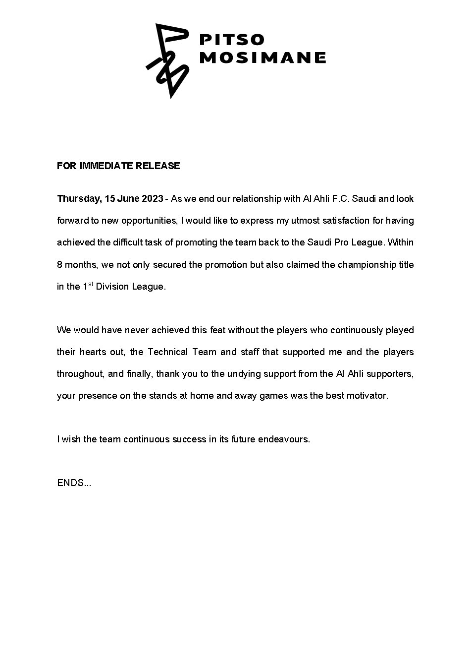 أعلن المدرب الجنوب إفريقي بيتسو موسيماني، رحيله رسمياً عن تدريب نادي الأهلي السعودي، وكان قد تولى تدريبه في شهر سبتمبر الماضي، وقاده للعودة إلى الدوري السعودي للمحترفين بعد عام من هبوطه.