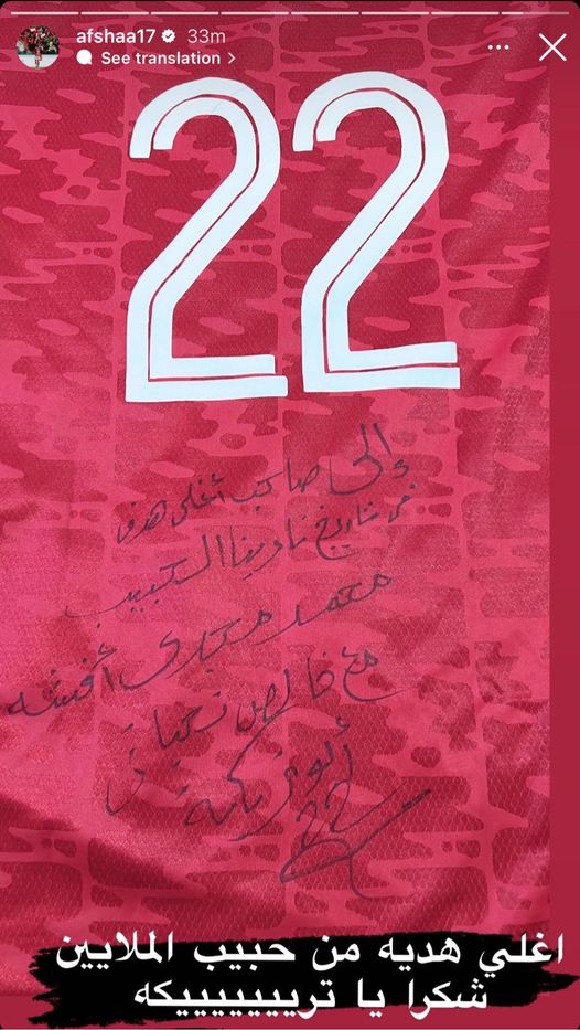 ونشر أفشة صورة للتيشرت عبر ستوري أنستجرام حيث كتب له أبو تريكة عليه: "إلى صاحب أغلى هدف في تاريخ نادينا الحبيب محمد مجدي أفشة مع خالص تحياتي.. أبو تريكا 22"، وعلق أفشة على الصورة وكتب: "أغلى هدية من حبيب الملايين، شكرا يا تريكه".