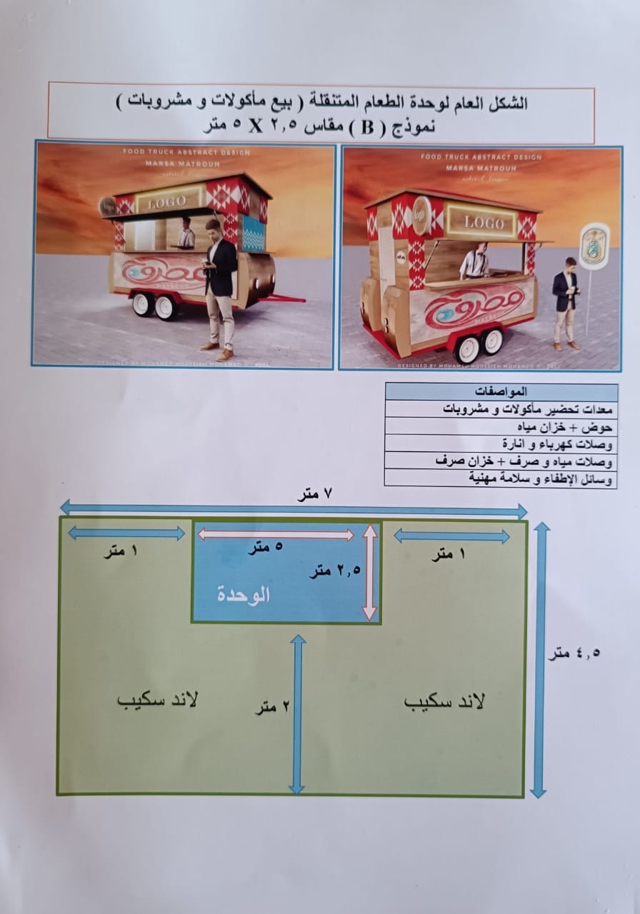 وتم مناقشة المناطق التى سيقام بها المشروع منها امام حديقة كليوباترا وسط مدينة مرسي مطروح بعدد ١٣ نموذج عربة الطعام المتنقلة مع التوجيه بتخطيط الموقع ووضع الفواصل وبما ييسر حركة السير والمواصلات ،مع توافر مصادر الكهرباء بالإضافة إلى المياه والصرف المجهز بها خزان مياه علوى وأحواض الصرف بالعربة.